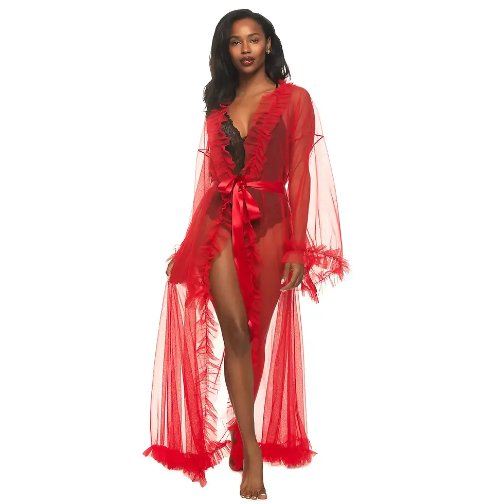 Veil Tulle Ruffle Peignoir Robe - Tango Red